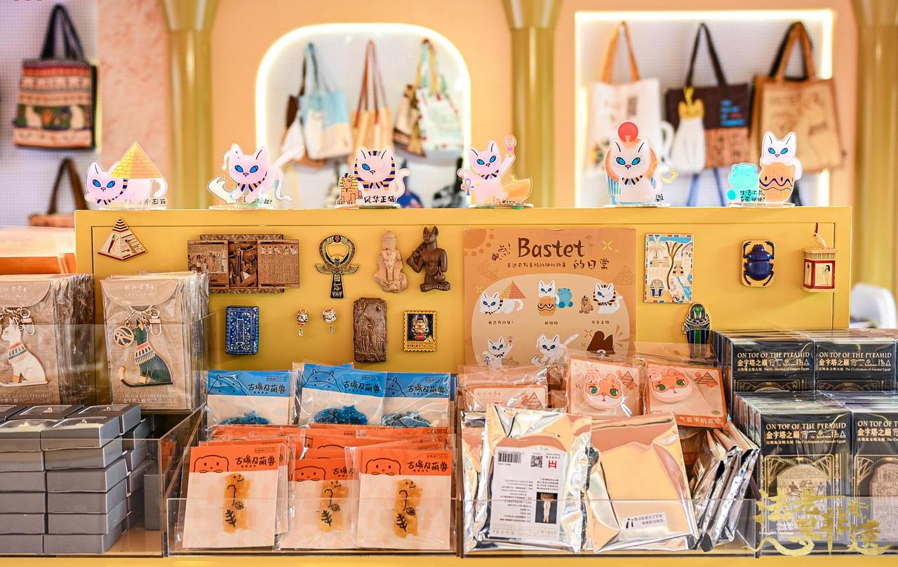 体验变装的观众正在打卡拍照。上海博物馆供图 汤世芬介绍,在“168小时”活动期间,埃及展推出了众神NPC巡游、埃及鼓表演等节目,以及象形文字破译局、文创工坊、趣味游戏等沉浸式互动体验,让这场古埃及文明探秘之旅更加鲜活生动。 博物馆夜游,让尼罗河的风吹到了更多观众。据悉,自2024年7月19日开展以来,埃及展已加开220个夜场、专场回应市民观展热情,并提供形式多样的展览阐释辅助手段,开展线下教育活动4023场,覆盖观众近130万人次。 跨界合作,“文博+”激活夜间经济 跟展览一样火爆的,还有馆内的文创商店。 最后一周,埃及展推出了大力度的文创促销活动:近500款文创产品开启5折促销活动,最低的只有10多元,另外还有福袋盲盒供观众挑选。 一边惊呼“好萌啊好萌”,一边努力克制掏空钱包的冲动,网友“玲好好”最后花了近2000元,给自己和朋友买了一打冰箱贴和帆布包。“姐妹们真不夸张,200元的门票进来,2000元的文创出去!”她在社交平台上这样分享自己的“扫货”感受。