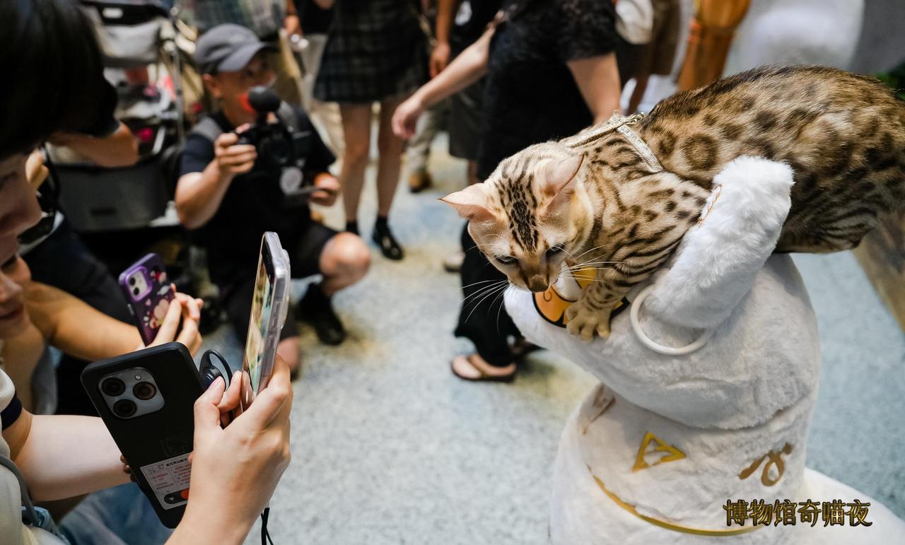 去年夏天,上海博物馆曾举办“博物馆奇喵夜”活动,连续10个周六延长开放3个小时,邀请观众携自己的宠物猫观展。相关话题浏览量5亿人次,带动人民广场周边酒店搜索量增长超50%。上海博物馆供图 博物馆的灯火通明,也点亮了周边市集。在上博南广场,光明邨、老大昌等老字号品牌摊位一字排开,埃及展观众凭票根即可享受近200余款精选商品专属优惠,试吃、购买的人群渐渐排起长队。 博物馆+文创、博物馆+老字号、博物馆+航空、博物馆+游轮……据不完全统计,埃及展联动了东方航空、锦江集团、携程旅游、悦星邮轮等社会资源进行了多维度的跨界合作。 这种跨界混搭,激发出了强大的消费力。据统计,配合展览,上博创新打造“一站式”文旅体验新场景系列活动,带动城市综合消费超200亿元。埃及旅游和文物部表示,展览甚至拉动了中国赴埃及旅游的热潮,埃及入境游中国游客数量增长65%,航班数量激增3倍。 “博物馆之夜”,还能如何进化? 事实上,“博物馆夜游”的概念由来已久。 1997年,德国柏林为了提升公众对博物馆的关注,首次尝试延长开放时间至深夜,结合灯光、音乐和特别导览,吸引了大批观众参与。2005年法国巴黎发起“欧洲博物馆之夜”,逐渐推广至全欧洲,成为了如今覆盖30多个国家和地区、数千家博物馆的年度文化盛事。 近年来,随着文博热持续升温,中国各地博物馆的夜场活动不断涌现,并在深厚文化的浸润下焕发出独特魅力:浙江自然博物院推出全国首家国有“24小时博物馆”,每个季度都有展品更新;成都金沙遗址博物馆的夜场活动场场爆满,古蜀文明在月光下闪耀;广州博物馆的“粤博之夜”连续推出七场主题夜活动,将文物展览与艺术表演融合……