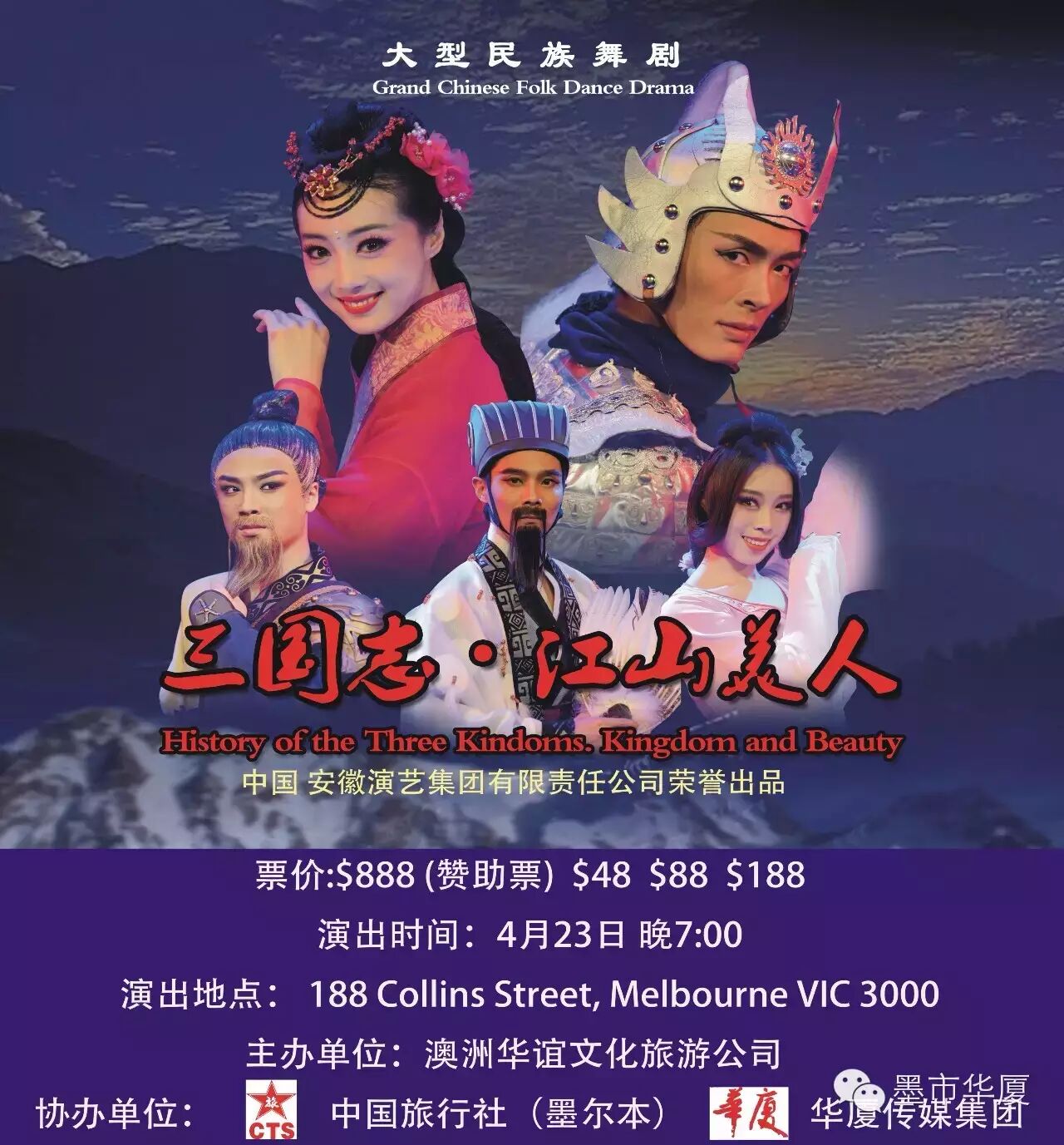 大型民族舞剧《三国志江山美人》即将于4月23日来墨尔本演出啦!让我们一起去追寻那缠绕千年的三国梦吧。 纵观古今中外,女性与战争从来就是一路同行。在战争的硝烟中,常常会出现女人娇媚的身影,她们不仅没有远离战争,甚至有时候还会影响战争的进程。三国时的大乔和小乔合称“二乔”,是中国古代历史上著名的大美女,分别是三国东吴霸主孙策和大将周瑜的妻子。唐代著名诗人杜牧《赤壁》中的诗句“东风不与周郎便,铜雀春深锁二乔”更是让这二乔家喻户晓。《三国志江山美人》舞剧的故事就是取材于此。 乱世之中,智计百出,倾尽所谋。谋士,运筹帷帐之中,决胜千里之外。她谋的是天下太平,谋的是与他一世长安。 志在天下的诸侯,戎马一生的将军,爱意深沉的旧人,谁与携手,共赴白首。 江山美人如此多娇,引无数英雄竞折腰。江山如画,美人如玉,乱世已成,群雄并起,争霸天下。这里既有儿女情长,又有豪情壮志,既有绝色美人,又有锦绣河山。 |