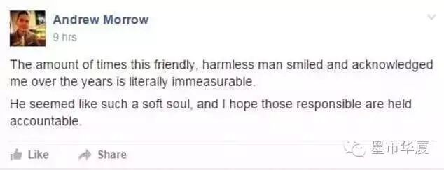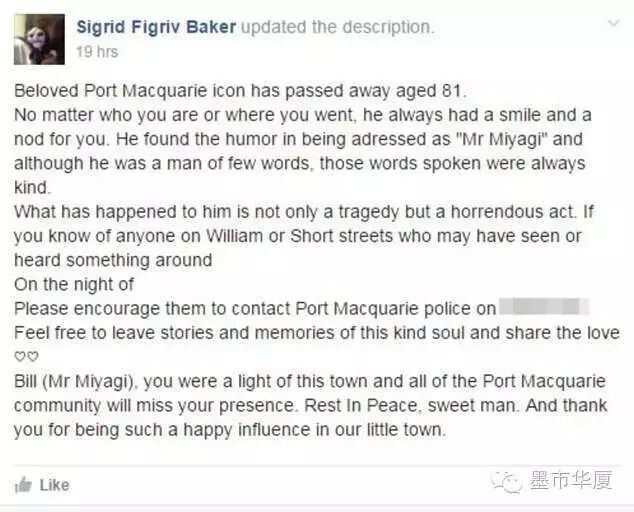 澳洲华裔老人被活生生打死,但是却死因不明!老人生前为人善良,受人尊敬,如今却以因为令人发指的暴力离开了世界。 这位华裔老人的名字叫做陈明作(Chok Ming Chan,音译),他是很久之前一代的老移民。生前在澳洲的工作是一位渔民,他被当地居民亲切地称为“Bill”或“Billiam”,还有一个根据电影《龙威小子》(The Karate Kid)得来的名字,叫做“Mr Miyagi”。 澳洲华裔老人被活生生打死,但是却死因不明!老人生前为人善良受人尊敬!这到底是为何般? 这位华裔老人的名字叫做陈明作(Chok Ming Chan,音译),他是很久之前一代的老移民。生前在澳洲的工作是一位渔民,他被当地居民亲切地称为“Bill”或“Billiam”,还有一个根据电影《龙威小子》(The Karate Kid)得来的名字,叫做“Mr Miyagi”。 得知他去世的消息后,人们纷纷在Facebook上分享他生前的故事。 当地居民在Facebook上设立了名为R.I.P. Mr (Bill) Miyagi的主页用以纪念陈明作。 有人留言写道:“几乎每周二都和这位传奇老人一起钓鱼。失去这么一位常带微笑的老人真是令人痛心。” “听到这个消息倍感震惊。他可是麦考利港的知名人物!我们会永远怀念。” 另一人写道:“我从小在麦考利港长大,小时候常常吹着号角,看见他就大声喊‘MISTER MIYAGI!’,他总是朝我们挥手微笑。麦考利港有很多广为人知的人,他是其中最耀眼的一位。” “这些年来我曾无数次见过这位友好、善良的老人。他仿佛拥有自由的灵魂,我真希望那些伤害他的人受到处罚。” 还有的人在主页分享陈明作的故事。其中一人写道:“每年圣诞节的时候,他都会来我们的车队与父亲聊天,临走的时候我们会让他带些鱼回家。这位善良的老人总是面带微笑。” 新州警方周二公布了陈明作的照片,希望寻找目击证人。请求一经发出就收到大量人士前去提供信息,然而警方确信还有很多知情人士尚未提供线索。 |